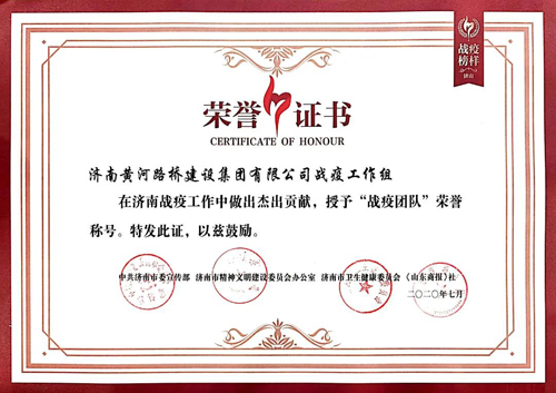为宣传弘扬先进典型,致敬“战疫”英雄,激励大家不忘初心、牢记使命,近日,中共济南市委宣传部、济南市精神文明建设委员会办公室、济南市卫生健康委员会、《山东商报》社共同主办的2020济南“战疫榜样”活动颁奖盛典举行。集团所属济南黄河路桥啪啪啦有限公司与金曰金宇公司联合党支部荣获“战疫团队”称号。