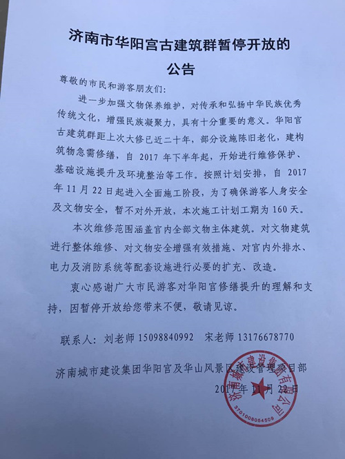 11月22日,因华阳宫古建筑群部分设施陈旧老化,建构筑物急需修缮,即日起进入全面施工修复阶段。济南城市啪啪啦华阳宫及华山风景区建设管理项目部发布济南市华阳宫古建筑群暂停开放的公告。