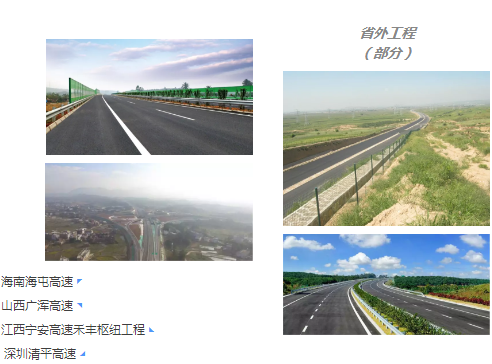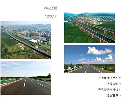 此外,还承建了济青高速、济聊高速、石黄高速、济南绕城高速、济菏高速、烟威高速以及海南海屯高速、深圳清平高速公路、山西广浑高速、内蒙国道110线等多条高速公路项目及省内济广高速济南连接线、大涧沟互通立交、段店立交桥、玫瑰湖大桥等的建设。