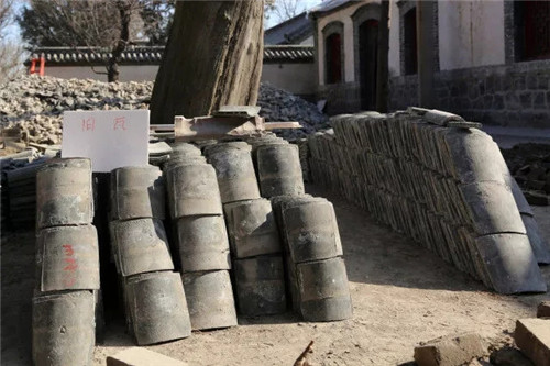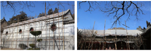 目前,所有古建的勘查检修工作已经完成,年久失修的房顶苫背、望板等已全被撤下,色泽与功能都已陈旧建筑油漆也被逐层敲除,临时撤下的古砖古瓦、飞檐檩条等都被整齐编号入库,以作后用。