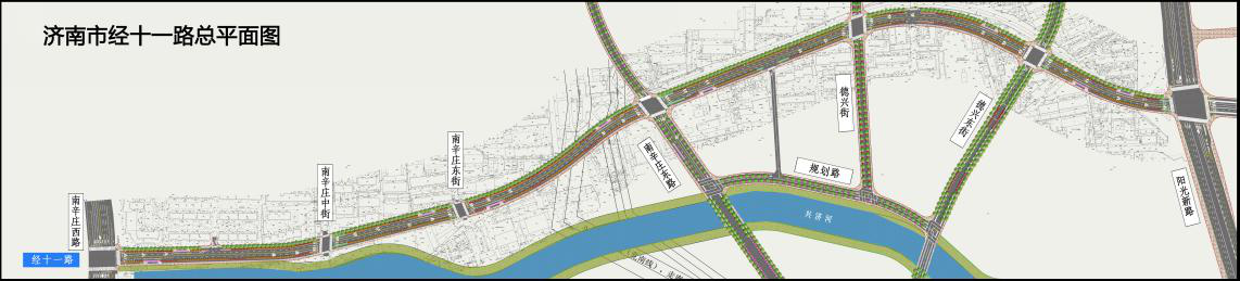 经十一路(南辛庄西路-阳光新路)建设工程位于济南市槐荫区,东起阳光新路,西至南辛庄西路,道路规划红线宽度为30米,快车道双向四车道,全长约1967.99米,投资概算1.39亿元。主要建设内容包括新建道路、敷设雨污水管线,配套实施给水、燃气、热力、弱电、电力等土建工程,同步进行道路绿化、路灯、交通设施等建设。