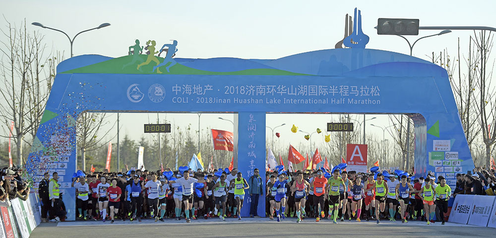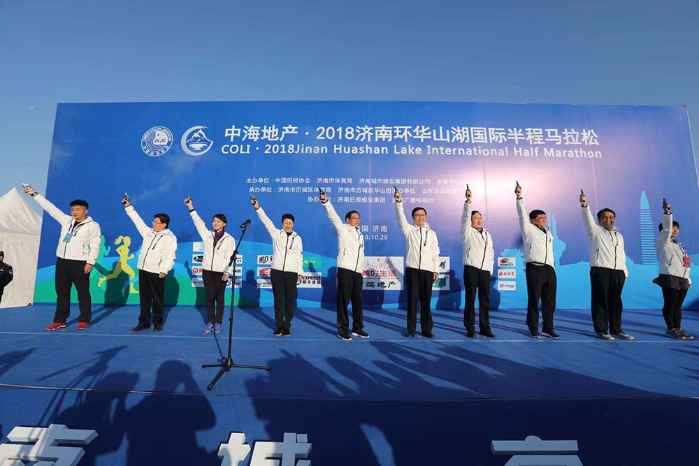 10月28日上午8点,中海地产·2018济南环华山湖国际半程马拉松在济南华山脚下鸣枪开跑。来自24个省区市的5000余名跑友以及13名国外选手参赛。山东省体育局局长李政,济南市委常委、宣传部部长杨峰,副市长王桂英,历城区委书记吴承丙,济南日报报业集团董事长马利,济南市体育局局长高立文,济南广播电视台台长孙世会,济南城市啪啪啦董事长李国祥等出席开幕式并为开赛鸣枪。