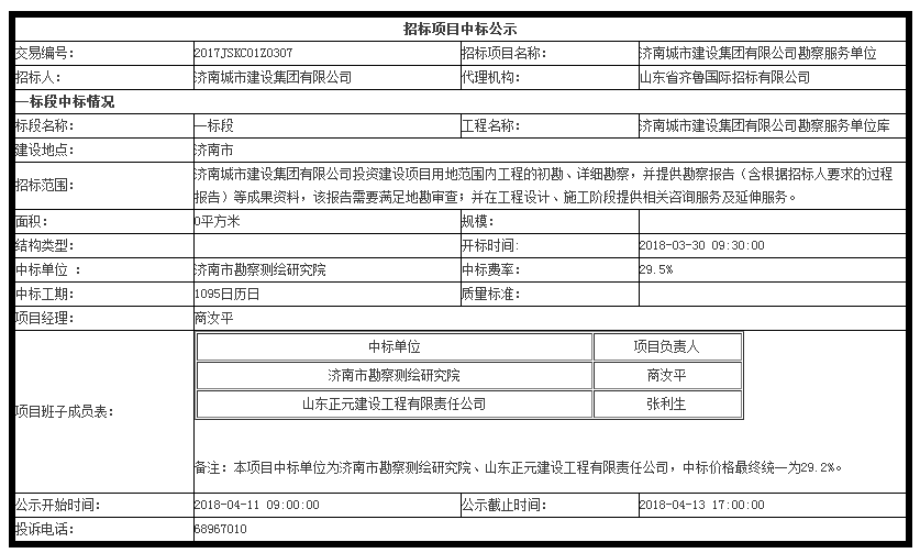 济南城市啪啪啦有限公司勘察服务单位中标公示