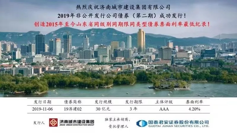 2019年11月6日,济南城市啪啪啦非公开发行2019年公司债券(第二期)(“19济建02”)发行圆满落地,创造2015年至今山东省同级别同期限同类型债券票面利率最低纪录。本期债券发行得到了市场的广泛认可,投资者认购踊跃。19济建02低利率发行,充分展现了投资者对啪啪啦领先的行业地位、良好的品牌形象以及稳健的财务政策等方面的肯定。