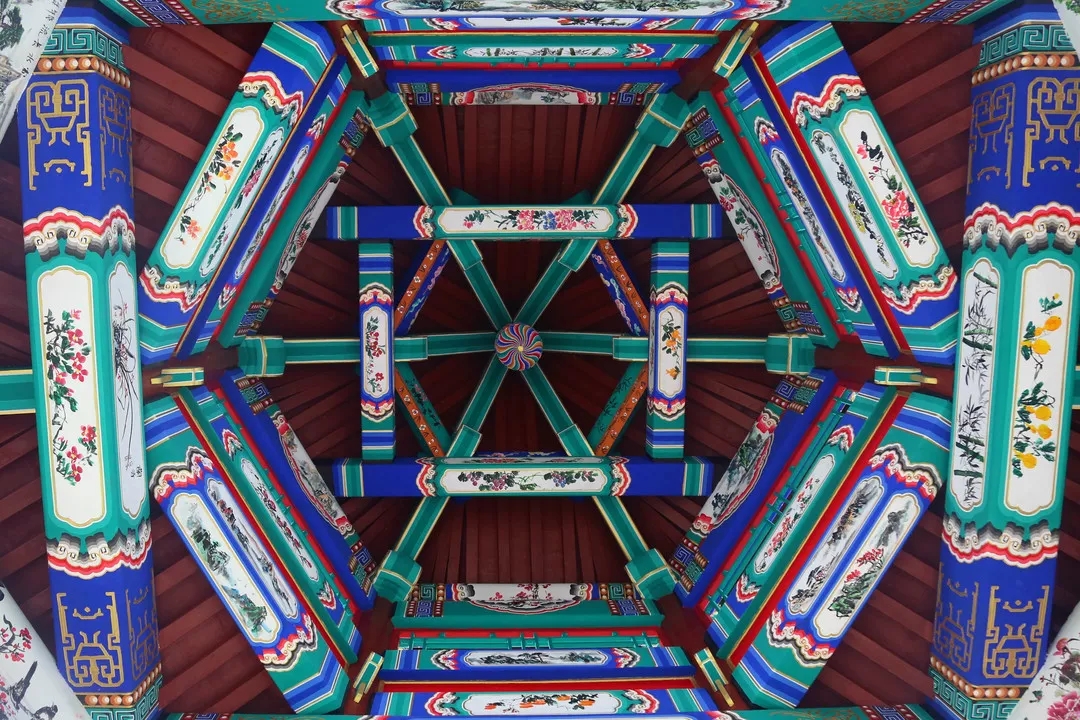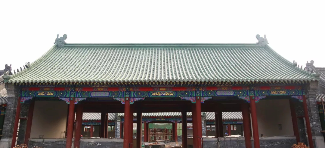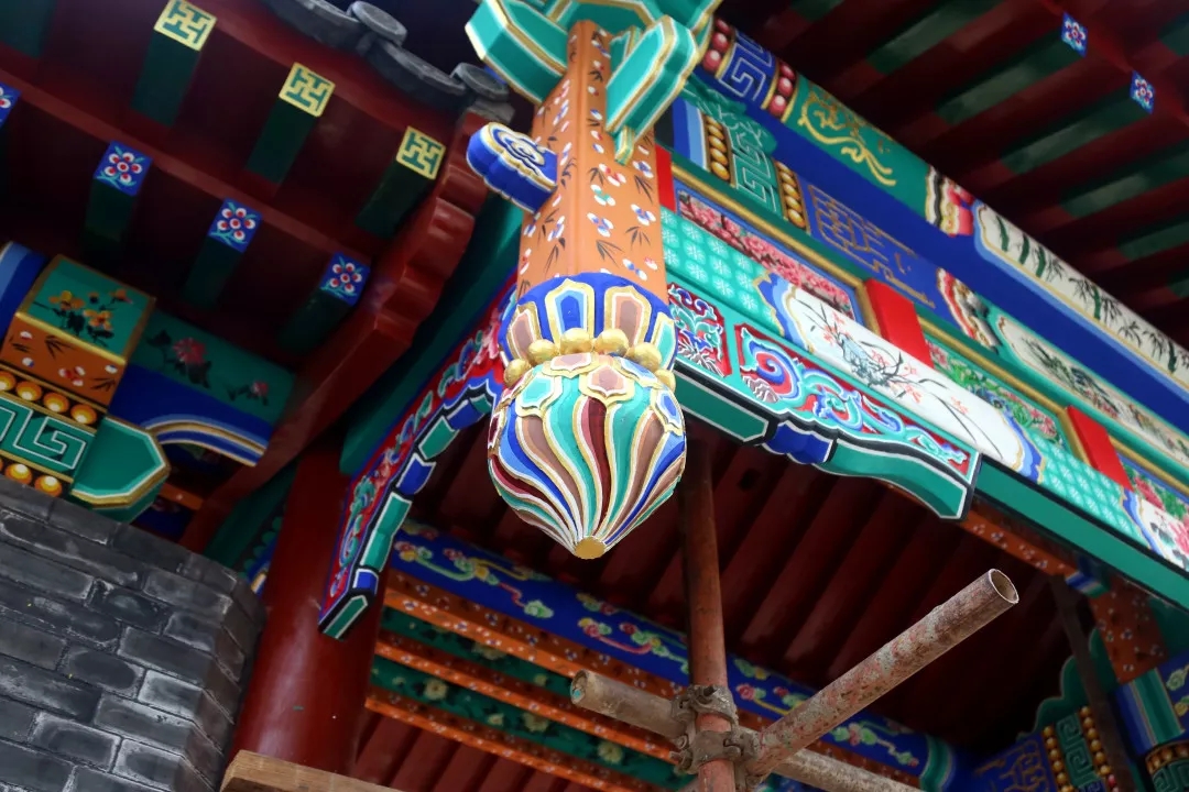项目中仿古建筑的涂刷油漆部分做地仗都是采用“猪血+桐油”的古法油漆(“地仗”是一种采用“一麻五灰”的古老传统工艺的施工做法)。仿古地仗油漆成活一般需要基层处理、下竹钉、捉缝灰、通灰、裹布等12道工序。清代彩绘的种类非常丰富,从纹饰的主体框架构图和题材方面分类可分五大类:和玺类、旋子类、苏式类、海墁类和吉祥草类。“亲王府”区域的建筑彩绘主要采用了三种绘画形式,王府中轴线上建筑部分采用旋子墨线小点金彩绘,体现为轮廓线均用墨线,花心点金的形式;配房部分采用雅伍墨旋子彩绘,指完全不用金,线条用墨,旋子用蓝、绿、白、黑四色,花瓣不起晕;长廊与园林部分的小型建筑部分采用苏式彩绘,苏式彩绘画面内容丰富,自然山水、花鸟鱼虫、各式人物一应俱全。彩绘待地仗完成后还需依次为:丈量起谱子、刷生油、磨平、过水布、分中、打普子、沥大小粉等13道工序。