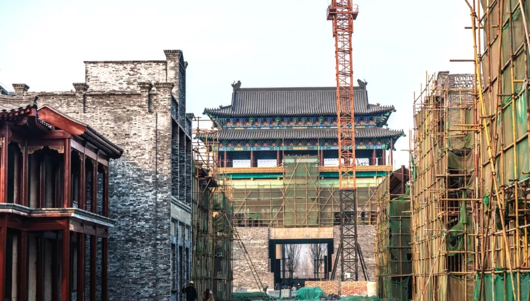 项目所有建筑中,最具标志性的当属城门楼,同时,这也是项目内工程量最大、工期最长的单体建筑。其中城墙高度为8.7米,城门楼最顶端高度为29.5米。仅城门楼施工使用的钢管就已达20万米,占整个项目钢管消耗量的近一半,从基础施工到主体完工,耗时近4个月。城门楼的彩绘部分采用的是旋子彩绘形式,用或圆润饱满、或流畅柔韧的各色线条旋转盘结而成,最大的特点是在藻头内使用了带卷涡纹的花瓣,旋子常用于殿式彩画,既素雅又华美。