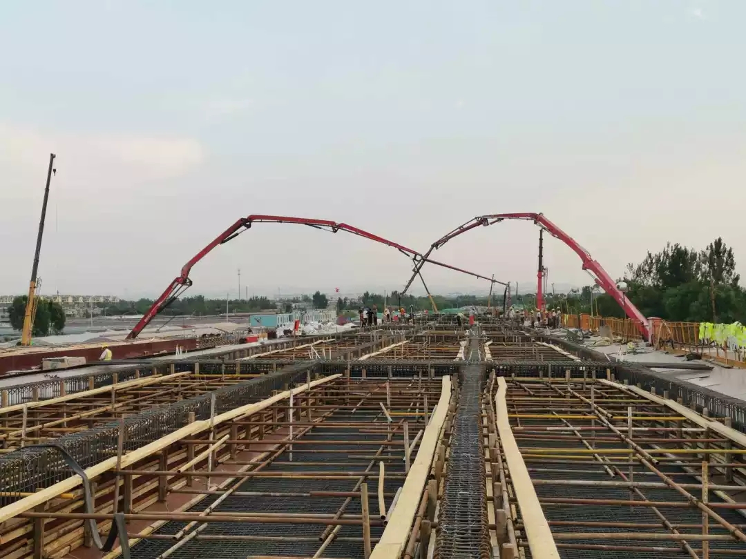 1号高架桥施工中,共投入5个施工队伍、29个施工班组,870多名工人,采用平行、流水施工相结合及网络计划图指导,进行有序、平衡、连续施工,统筹安排,做到“三早一快”即早进场、早安家设营、早开工、尽快形成大干局面。项目部倡导“严管就是厚爱”“今天再晚也是早、明天再早也是晚”的管理理念,严管管理人员、严控支架搭设、预应力张拉、波纹管定位、保护层控制、混凝土质量把控等关键环节。与征拆抢进度、与天气抢进度、与施工环境抢进度,凝心聚力、攻坚克难,坚持奋战221天,1号高架桥顺利贯通!