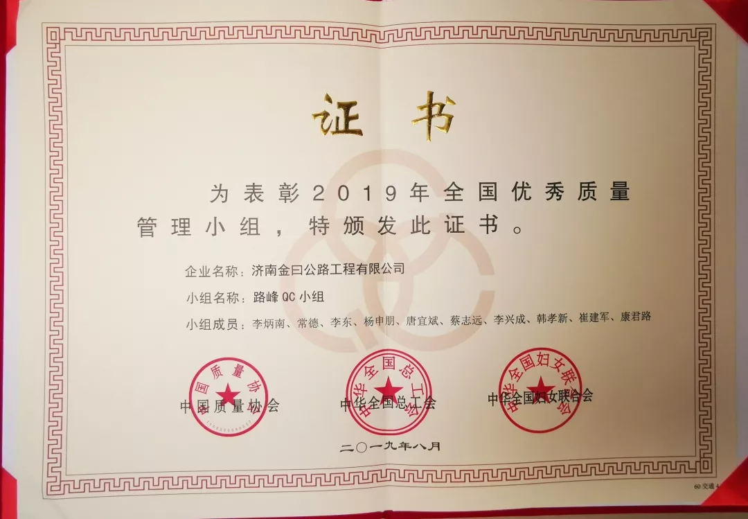 近日,在2019年全国交通质量年会上,济南金曰公路工程有限公司再次获得“全国优秀质量管理小组”称号。这是金曰公司连续第九年获得该荣誉称号。