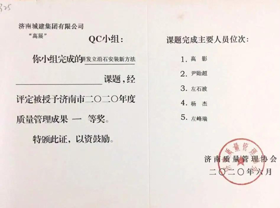 金曰公司一直高度重视质量管理工作,将质量视为企业生存的基础。近年来建设市场竞争日趋激烈,公司结合行业和上级部门的质量提升活动,不断完善质量管理体系,有针对性的解决管理和施工的问题,培养了一批优秀的技术和管理人才。公司广泛开展的质量管理工作和QC成果申报工作,激发了广大员工主动发现问题、解决问题的积极性和创造性,推动了公司质量、管理、科技等创新工作不断向纵深发展,荣获的“2020年度群众性质质量管理活动优秀组织奖”更是对公司质量管理工作的充分肯定。