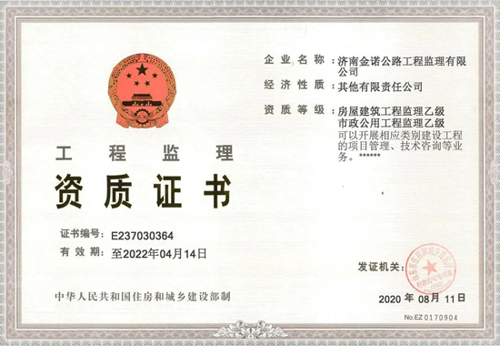8月11日,经山东省住房和城乡建设厅批准,济南金诺公路工程监理有限公司成功取得房屋建筑工程监理乙级资质。