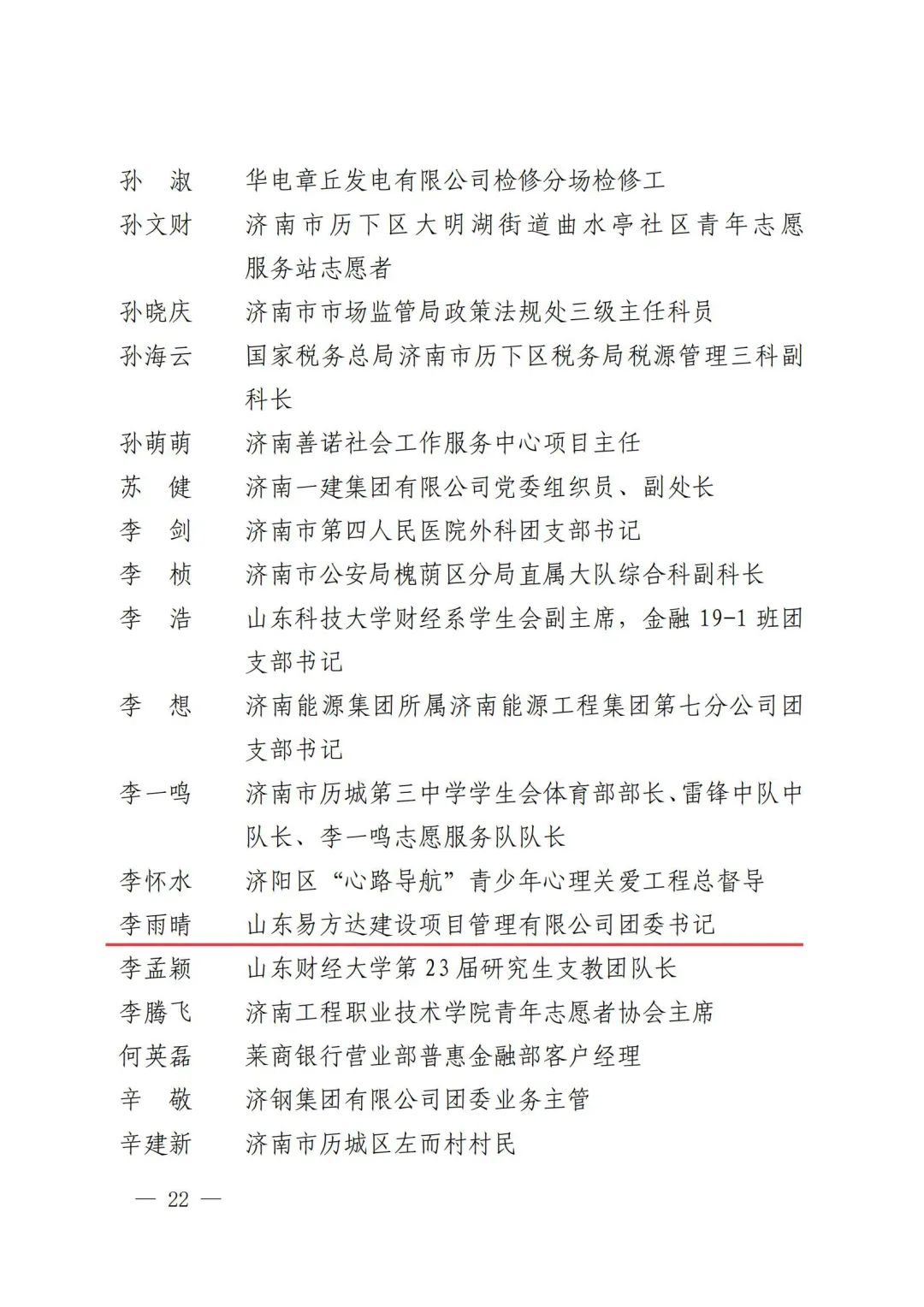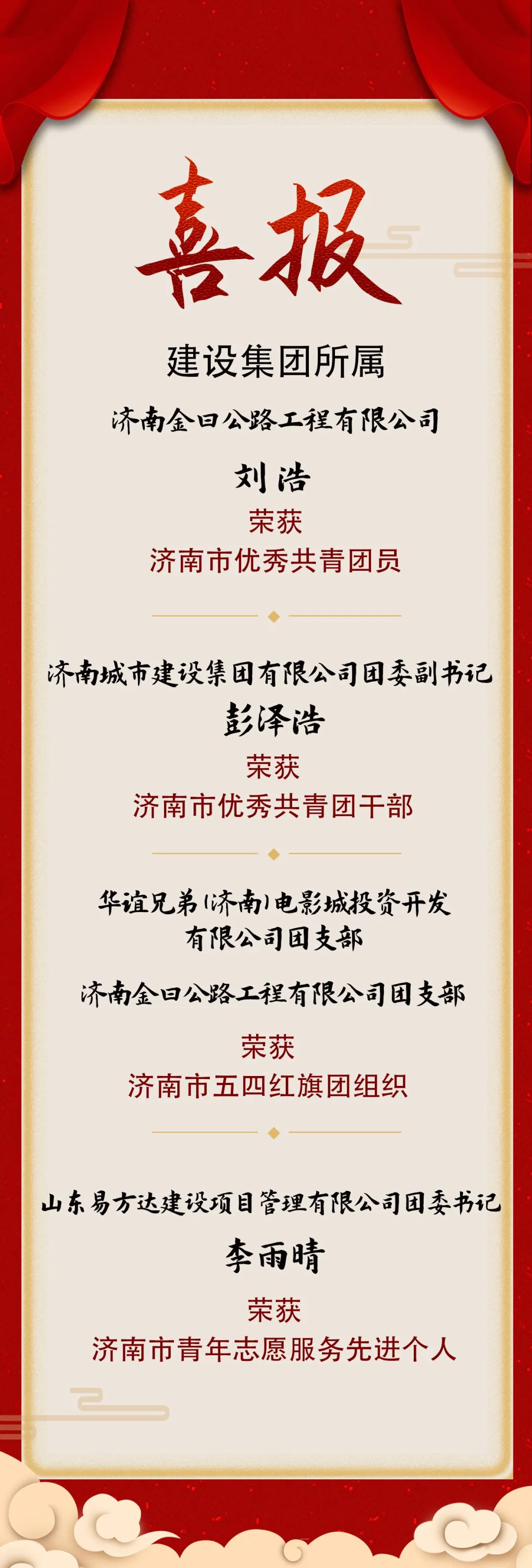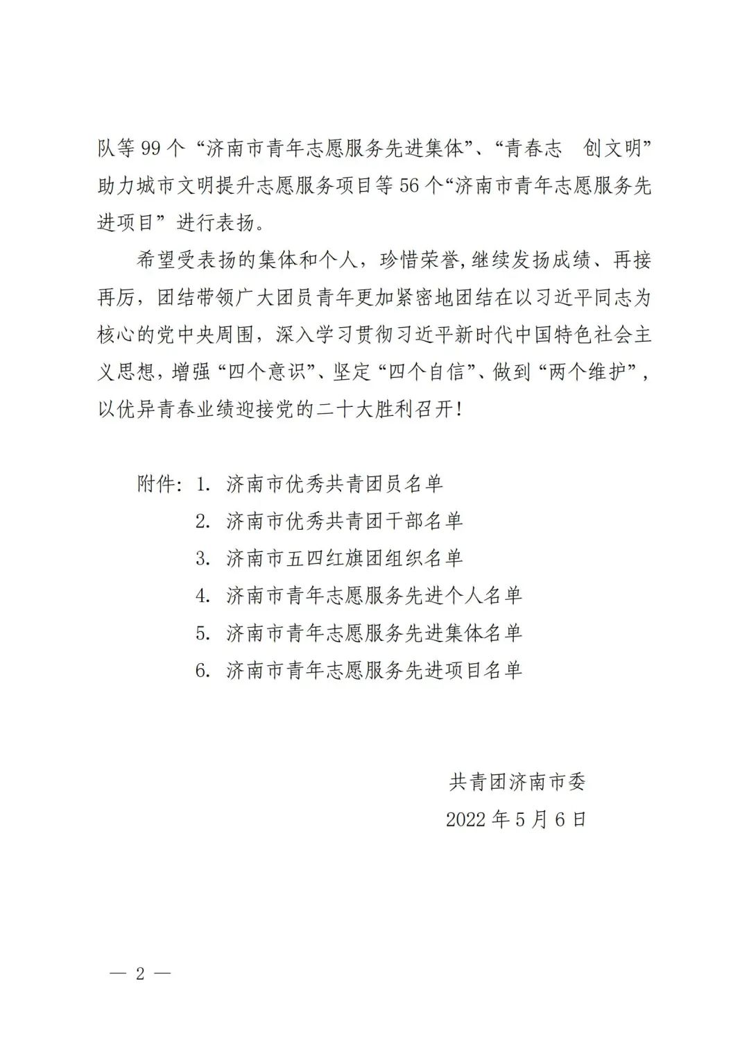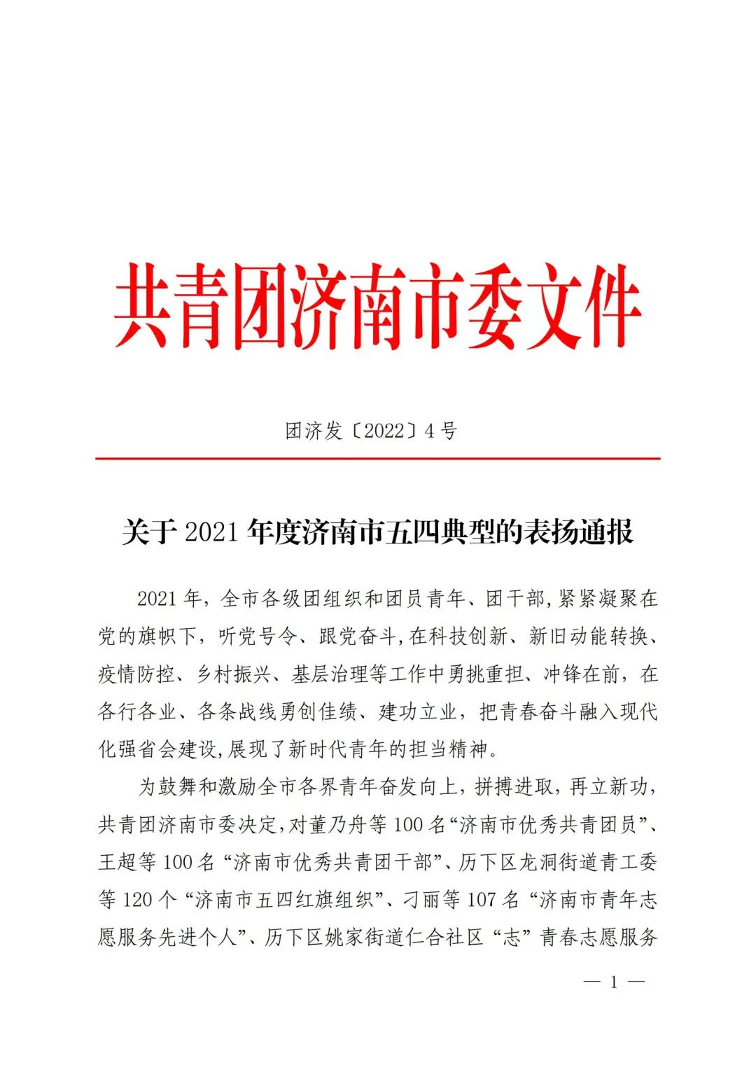 近日,共青团济南市委公布了《关于2021年度济南市五四出彩典型的表扬通报》,啪啪啦团委所属团组织及团员青年荣获“济南市五四红旗团组织”“济南市青年志愿服务先进个人”“济南市优秀共青团员”“济南市优秀共青团干部”等4项荣誉称号。