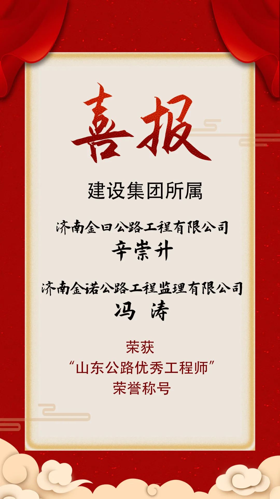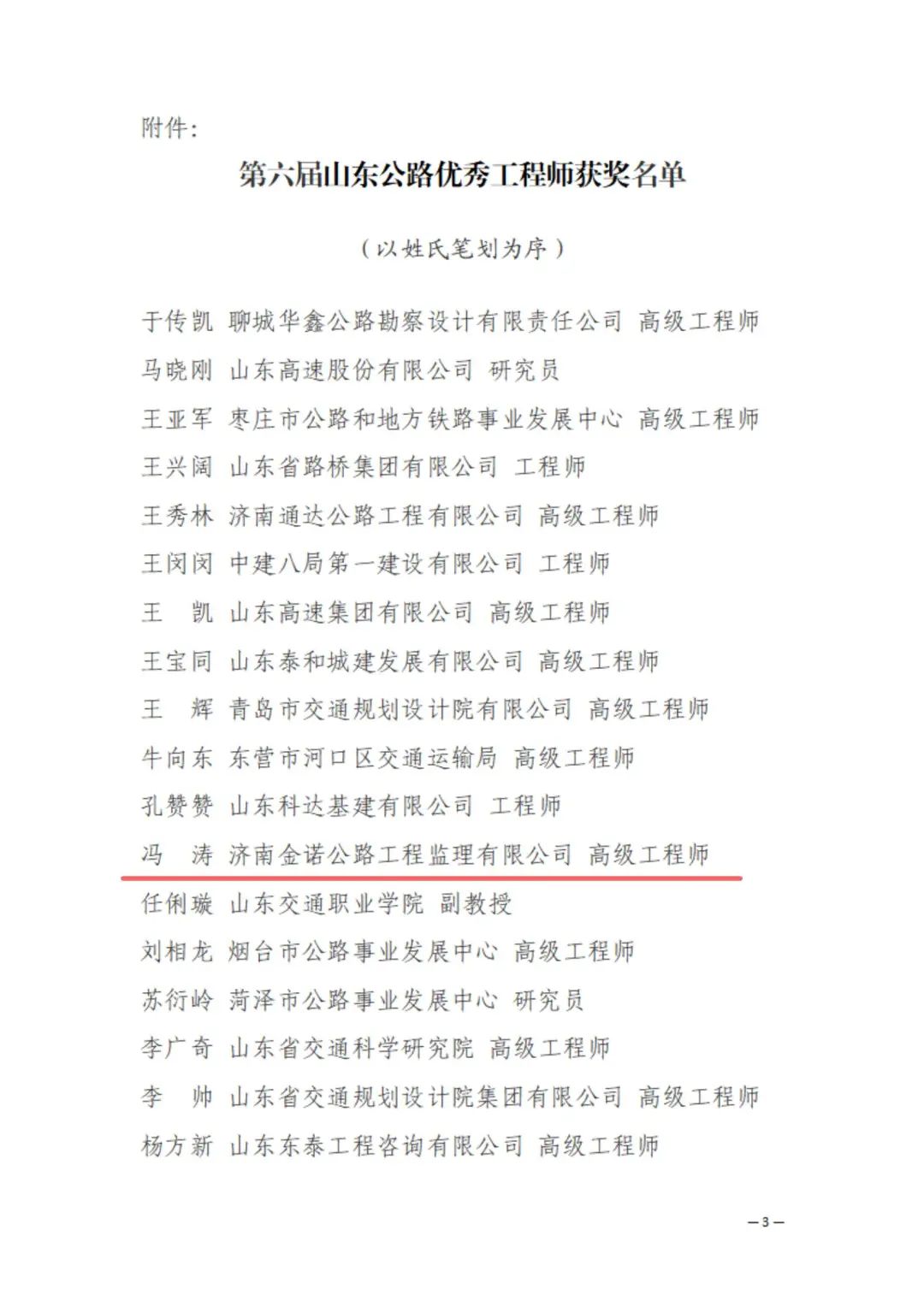 近日,山东公路学会发布《山东公路学会关于表彰第六届山东公路优秀工程师的决定》的通知,啪啪啦所属济南金曰公路工程有限公司副总经理辛崇升、济南金诺公路工程监理有限公司副总经理冯涛荣获 “山东公路优秀工程师”荣誉称号。