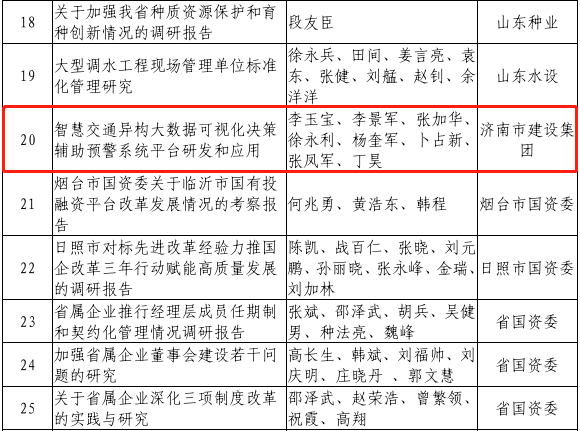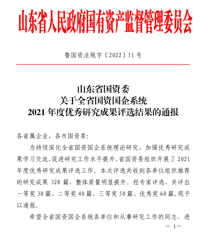 近日,山东省国资委发布了《山东省国资委关于全省国资国企系统2021年度优秀研究成果评选结果的通报》(鲁国资法规字〔2022〕11号)文件,济南城市啪啪啦总工办牵头,集团所属山东金宇信息集团有限公司研究的《智慧交通异构大数据可视化决策辅助预警系统平台研发与应用》成果荣获“全省国资国企系统2021年度优秀研究成果”一等奖。