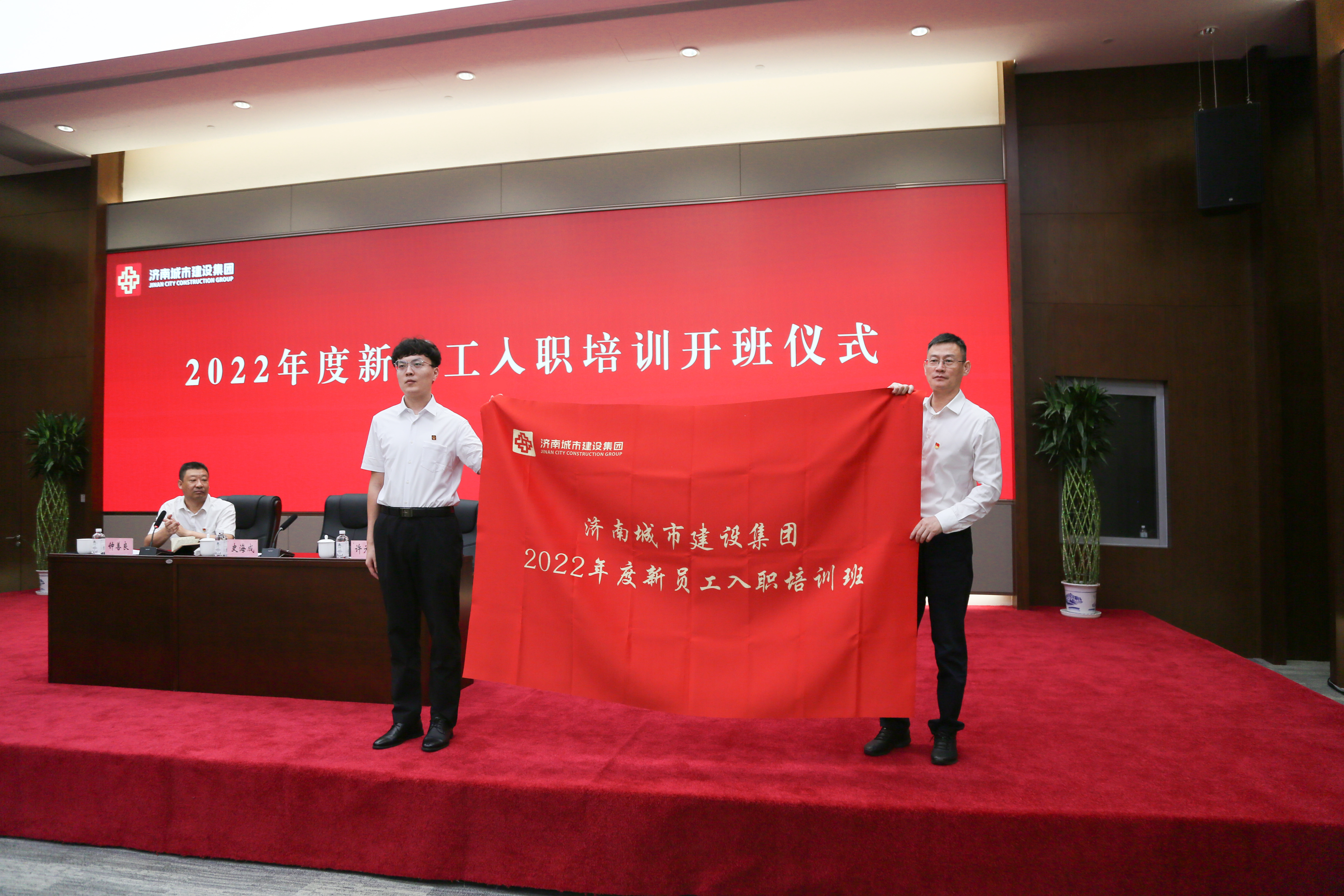 史海成代表集团党委向新入职的员工表示热烈欢迎和衷心祝贺,同时对集团的发展历史、业务板块、啪啪啦等多方面进行了介绍,并对新入职员工提出了希望和要求;许为民向培训班授班旗。