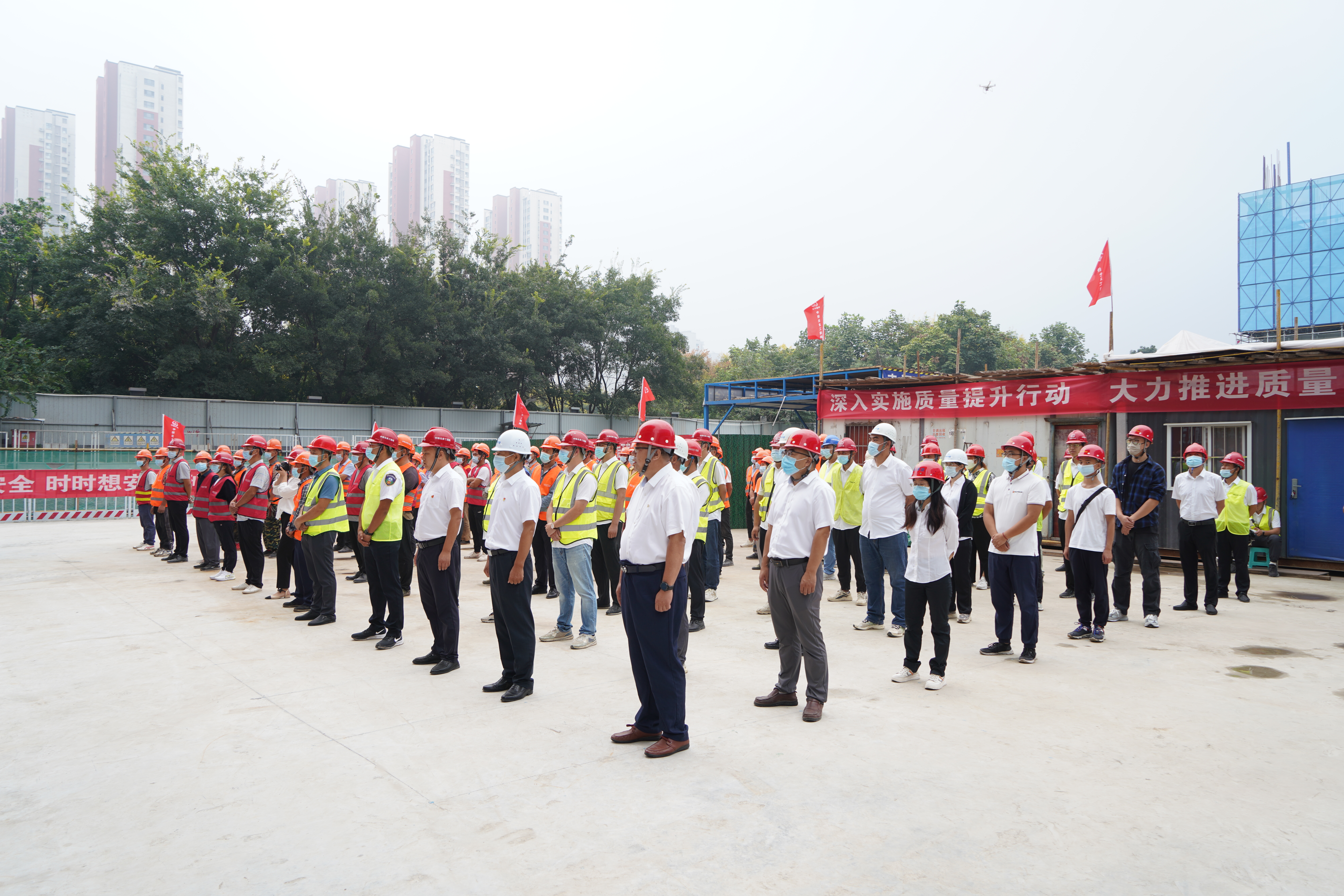 项目建设中,项目党支部充分发挥基层党组织战斗堡垒作用,以“三面旗帜进班组,工匠精神铸精品”为载体,深度融入施工生产,不断强化员工的责任担当意识,有力促进安全生产,并认真开展创建廉洁示范项目部活动。同时,项目建立质量管理体系,明确分工和责任,明确奖罚机制。成立QC质量活动小组,重点对装配式安装进行科研;每个分部分项工程编制质量专项方案,每道工序开工前进行交底,严格执行“首件样板制度”过程实施“三检制度”,发现问题形成清单记录,及时闭合整改,实现疫情防控、工程建设、文明施工同步推进。