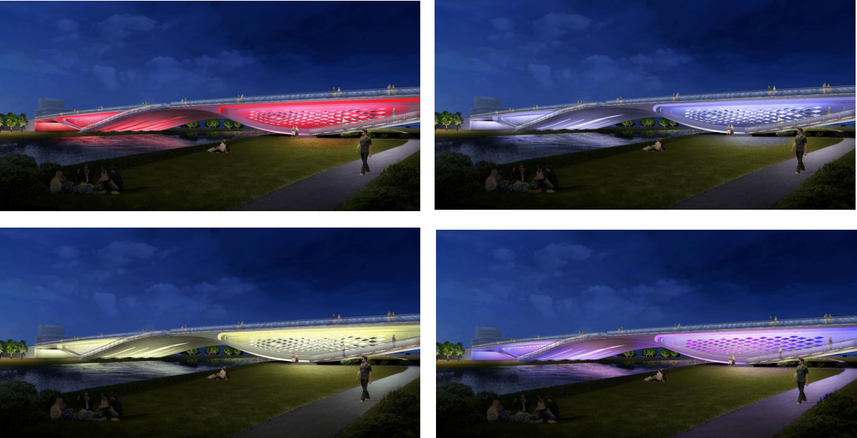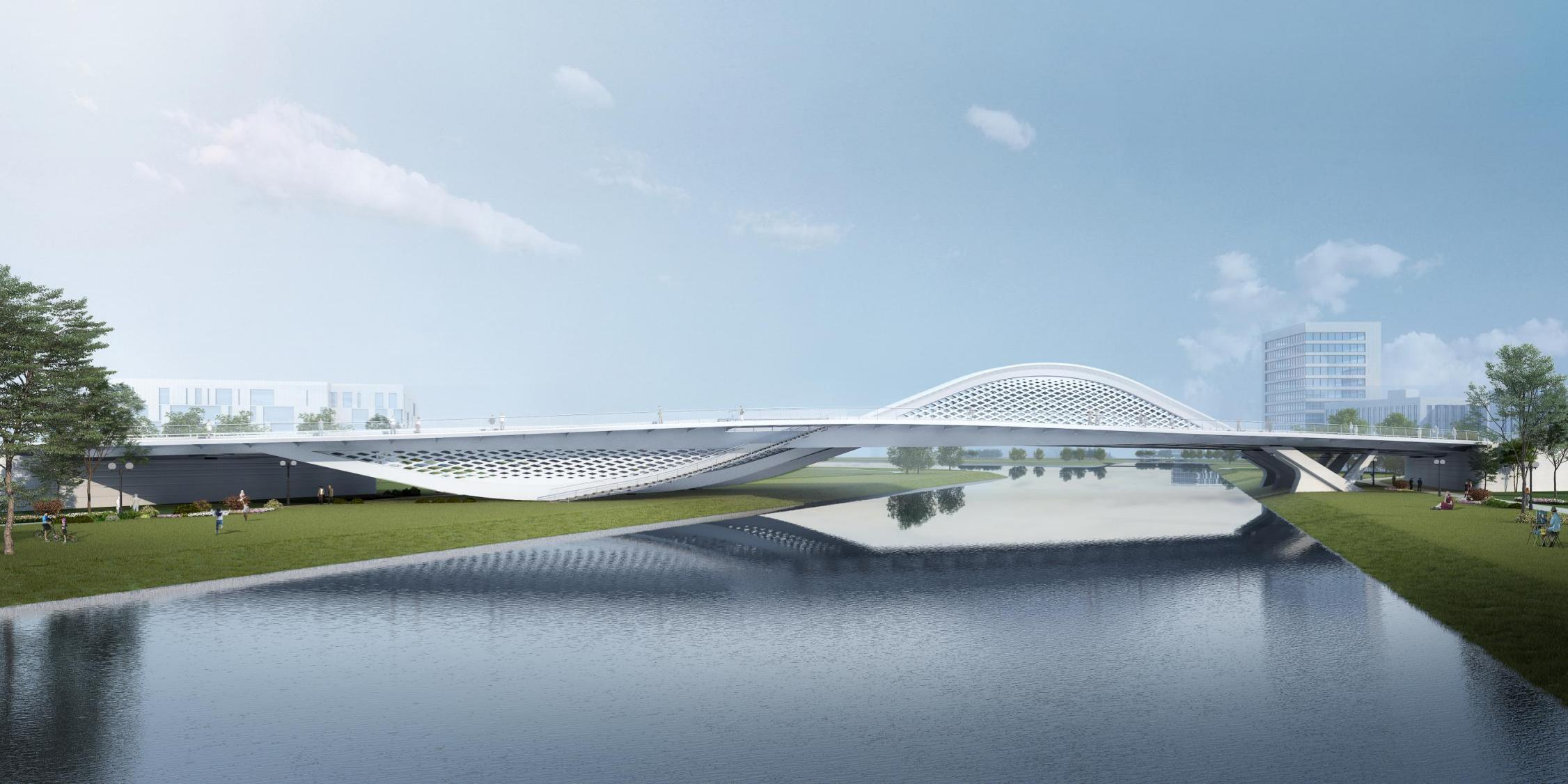 横一路、横二路大寺河桥作为起步区规划的第一批景观桥梁,由济南城市啪啪啦有限公司受委托建设,两座桥梁由世界著名桥梁设计师Marc MIMRAM先生主设计,通过研究济南的历史和文化,以泉与太极这个设计为根基,将泉城的刚中有柔、柔中带刚,与太极互为印证,力与美相结合,完成两座景观桥梁的设计。