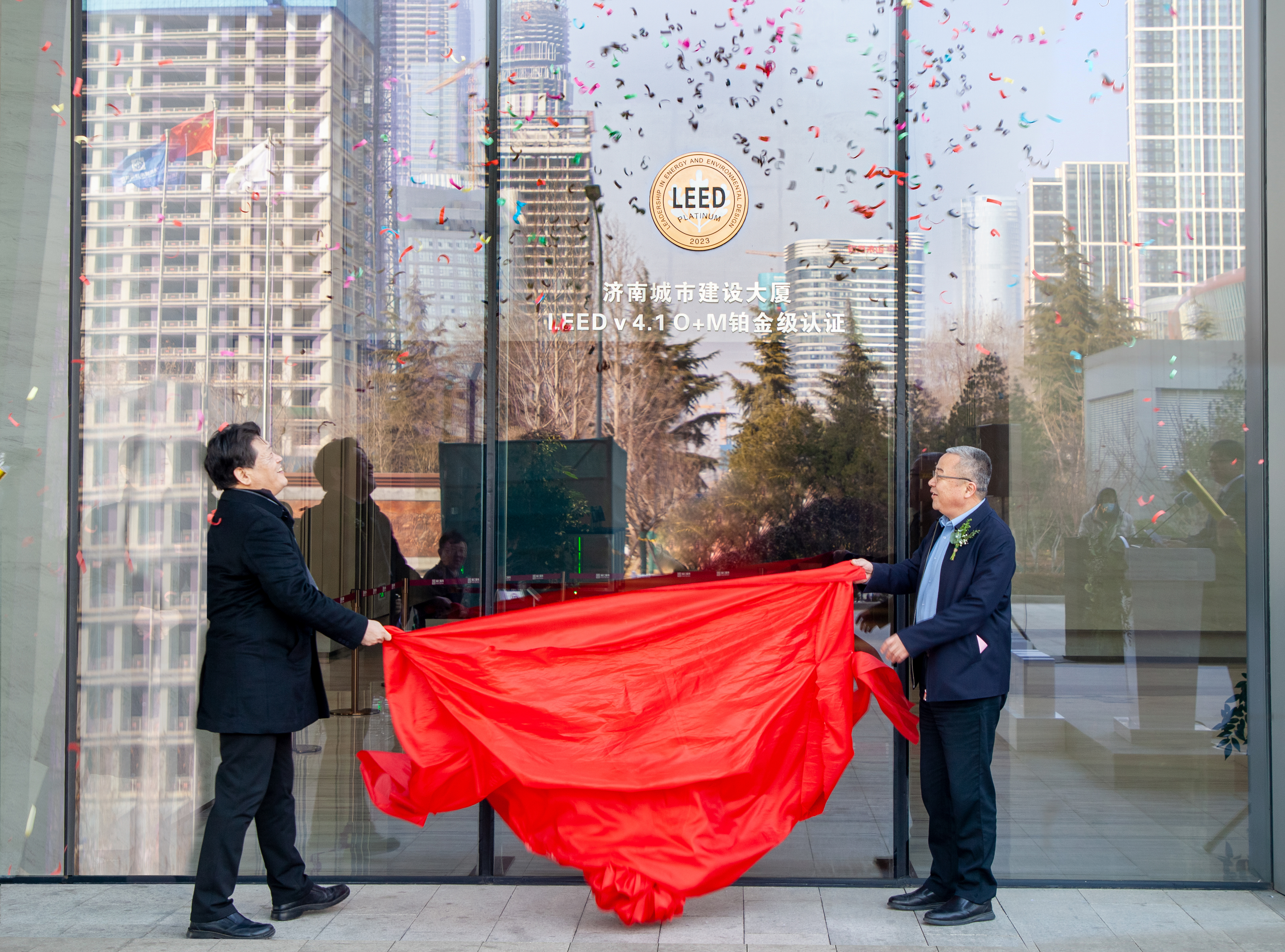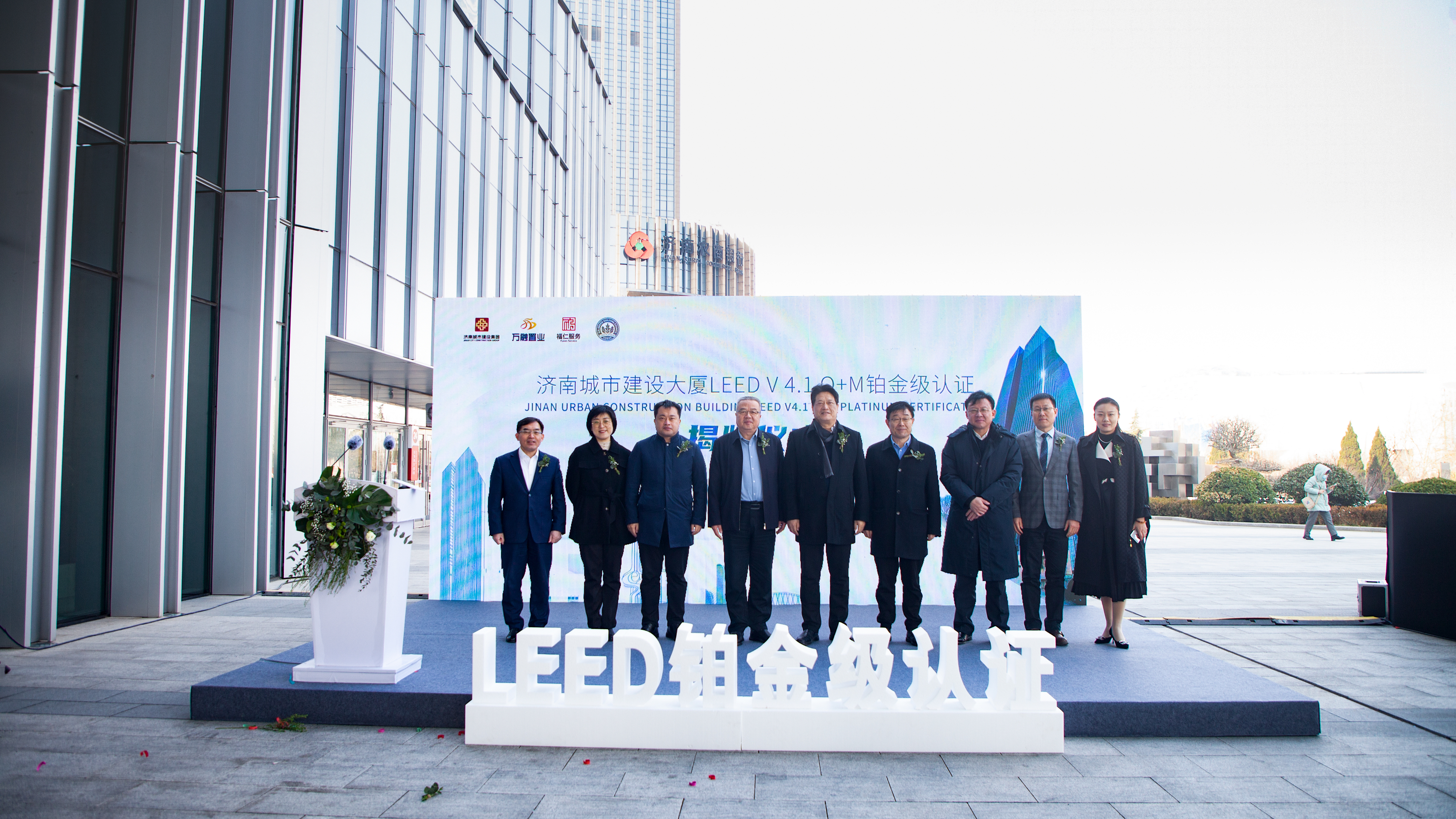 2月16日上午,济南城市建设大厦LEED v 4.1 O+M铂金级认证揭牌仪式举行。市城乡和住房建设局副局长张庆华,市住建局绿色建筑节能与科技处处长满意,啪啪啦咨询安玉坤,副总经理徐文东,副总经理杨晓东,副总经理侯涛出席活动。万融置业、福仁服务相关负责同志参加活动。