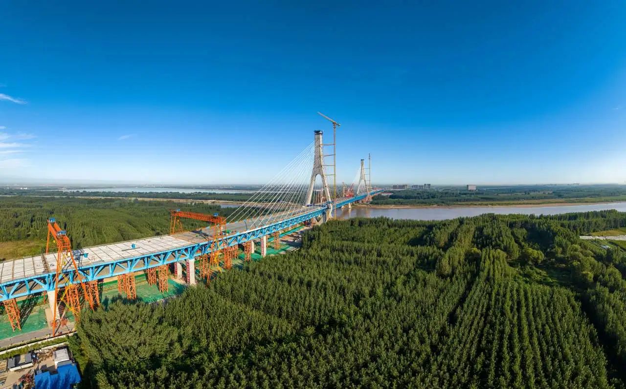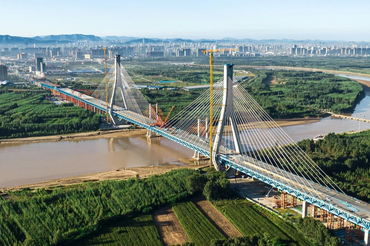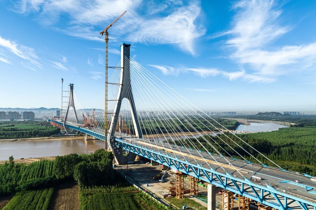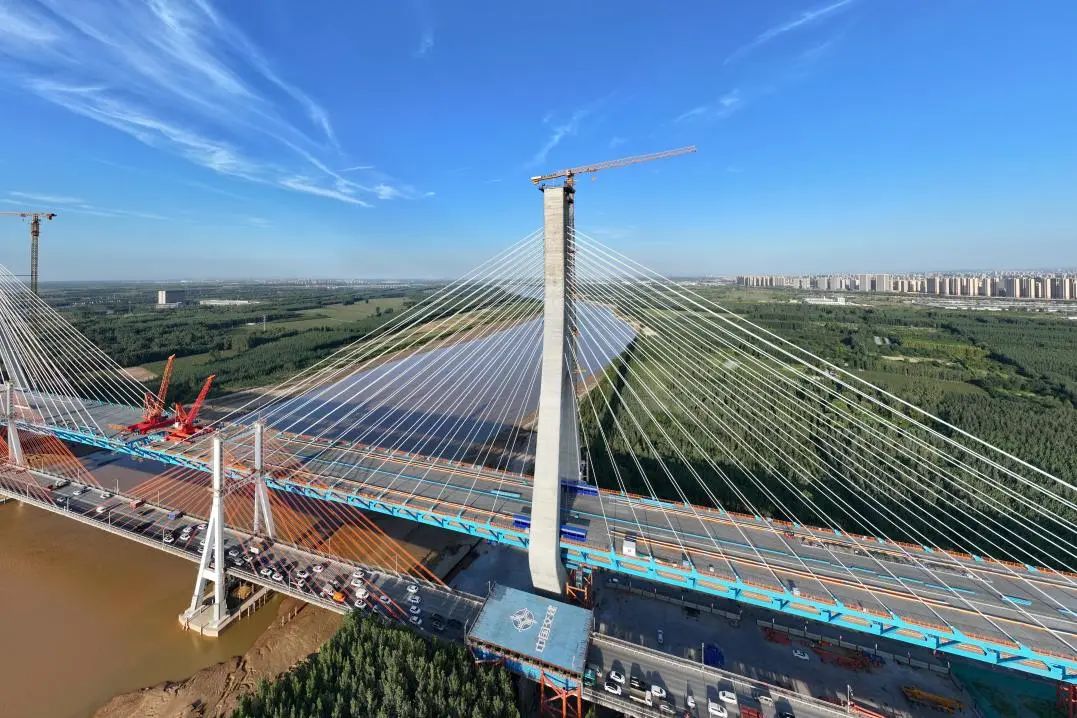 G104京岚线济南黄河公路大桥工程是连接济南新旧动能转换起步区与老城区的南北向主干道,是济南市“四桥四隧”规划建设的重要组成部分,对助推济南加速迈向黄河时代、促进起步区经济社会发展具有重要意义。项目采用双塔双索面公轨合建钢桁梁斜拉桥形式建造,全长7.748公里,主线桥梁工程长6.87公里,建设工期48个月,计划2025年6月底通车。