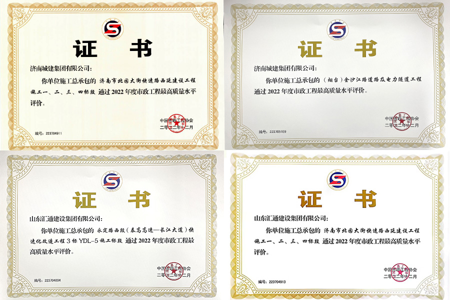 公司承建的济南市北园大街快速路西延建设工程、(烟台)金沙江路道路及电力隧道工程、永定路西段(泰高高速—长江大道)快速化改造工程获得四项“2022年度市政工程最高质量水平评价”。