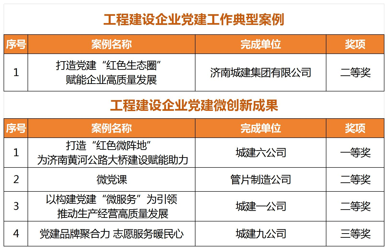 公司《打造党建“红色生态圈” 赋能企业高质量发展》党建工作案例获评“工程建设企业党建工作典型案例”二等奖,城建六公司《打造“红色微阵地 ” 为济南黄河公路大桥建设赋能助力》、城建一公司《以构建党建“微服务”为引领 推动生产经营高质量发展》等4项案例分别获评“工程建设企业党建工作微创新成果”一、二、三等奖。