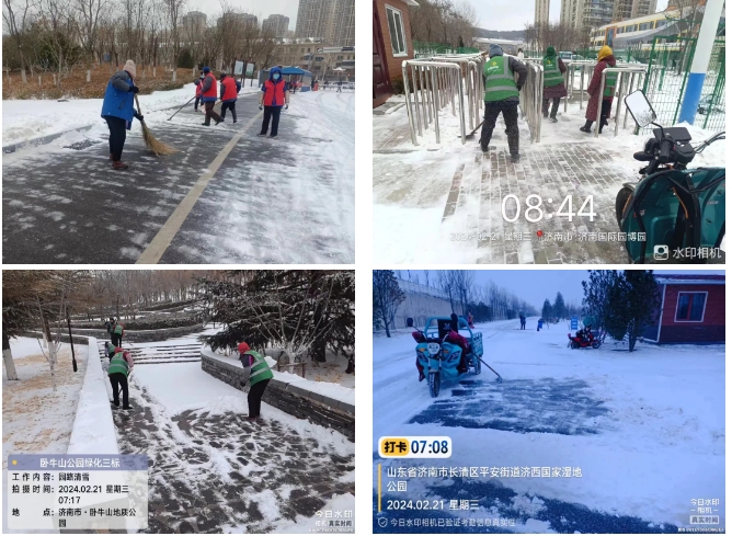 济南城市啪啪啦园区管理有限公司提前做出预判并发布相应通知,为恶劣天气应急管理做好全面准备。华山、济西湿地、济南园博园三大景区及时响应、迅速行动,全力组织开展扫雪除冰工作,利用扫雪车、雪锹、雪铲等工具,对景区内各出入口、广场、道路台阶等重点部位进行清雪、清冰工作并铺设相应防滑措施,保障道路畅通与市民游客安全,最大限度减少低温雨雪天气影响。