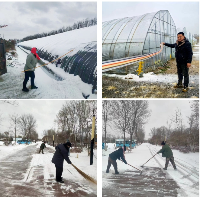 山东济西湿地生态农场有限公司提前组织人员检修温室大棚设施,保证正常运转,同时,加强棚内保温,指导租户及时关闭放风口、防风保温。加强值守和巡查,做到随下随清,尤其注意加强夜间除雪,避免积雪或冰层过厚压塌棚室,及时清理园内主次干道积雪,确保道路通畅。