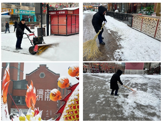 济南泉世界商业管理有限公司召集物业团队提前对印象济南·泉世界进行紧急除雪应对部署。根据特殊天气情况在商户群内提前下发温馨提示,提醒商家大雪天气地面湿滑、注意出行安全,同时做好相关保障措施。公司督导物业公司提前对除雪设施设备进行保养,备好除雪物资。街区从凌晨开始对商户门前、主干道及街区内外部道路进行清扫工作,借助扫雪机对主干道进行大清工作,为商户及游客开辟出畅通安全的道路。