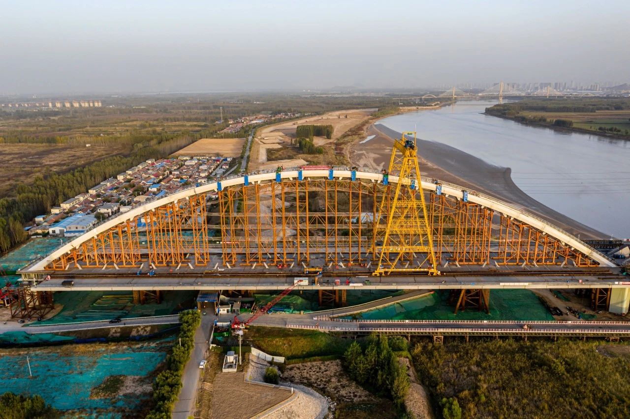 在420米跨拱肋提升中,施工单位中交二公局提出“梁拱分离顶推、先梁后拱、梁上架拱工艺”,创新研发“无合龙段整体提升合龙工艺”进行主跨拱肋架设,整体提升重量6800T,提升段跨径300m,提升高度25.5m,为桥梁领域首次研发并成功应用,被誉为“黄河第一拱、世界第一吊”。
