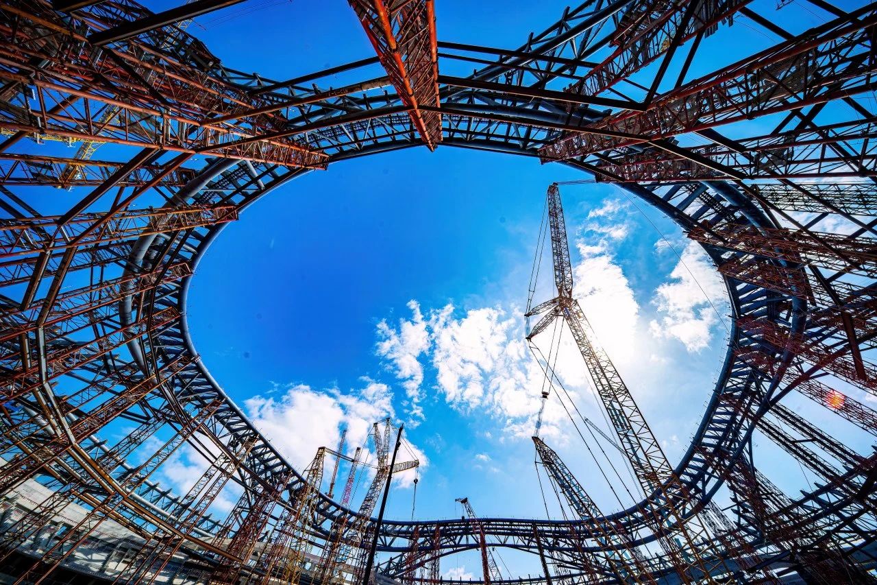 屋盖钢结构共包含88榀桁架,单榀钢桁架重约200吨,起吊高度超60米,相当于将一头成年蓝鲸提升20层楼。且精度要求在5毫米以内,对于构件强度与吊装精度都提出了较大挑战。