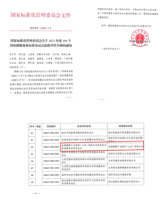 近日,根据《关于推进服务标准化试点工作的意见》(国标委农联[2007]7号)和《服务业标准化试点实施细则》(国标委服务联[2009]47号),经对国家级服务业标准化试点项目评估总结材料进行审核,国家标准化管理委员会确定2023年度104个国家级服务业标准化试点项目验收评估合格,啪啪啦所属金龄健康产业投资(山东)有限公司医养结合养老服务标准化试点通过验收。