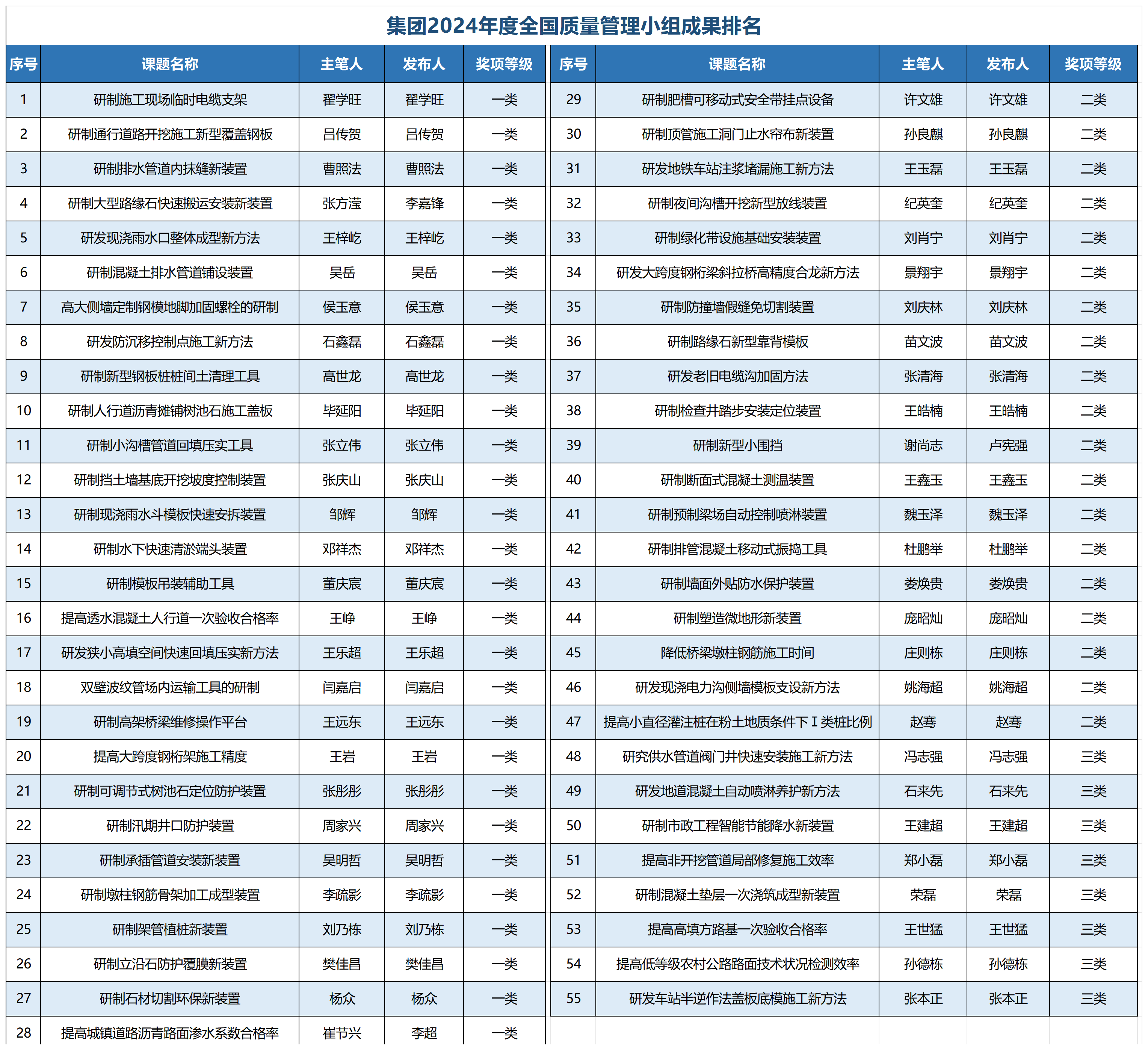 发布QC成果55项,其中,一类成果28项、二类成果19项、三类成果8项;发布质量信得过班组成果14项,其中,示范级班组8项、专业级班组5项、推进级班组1项。