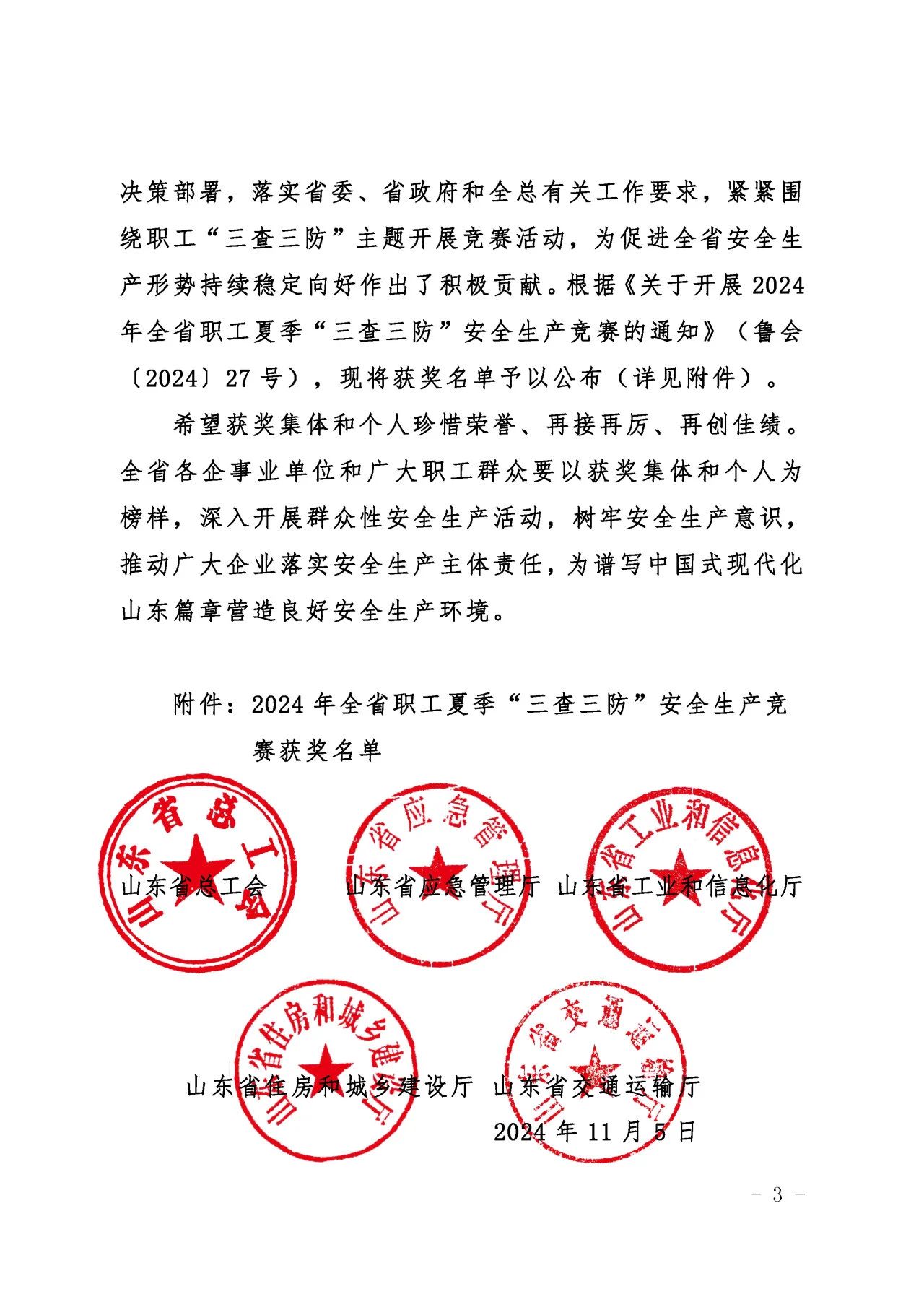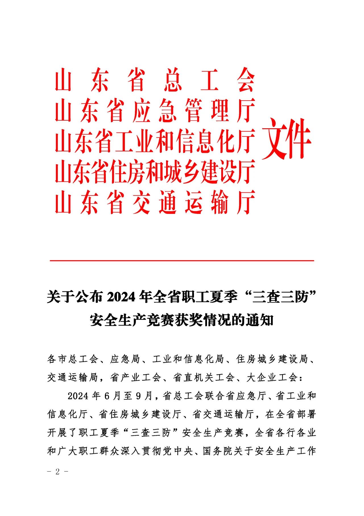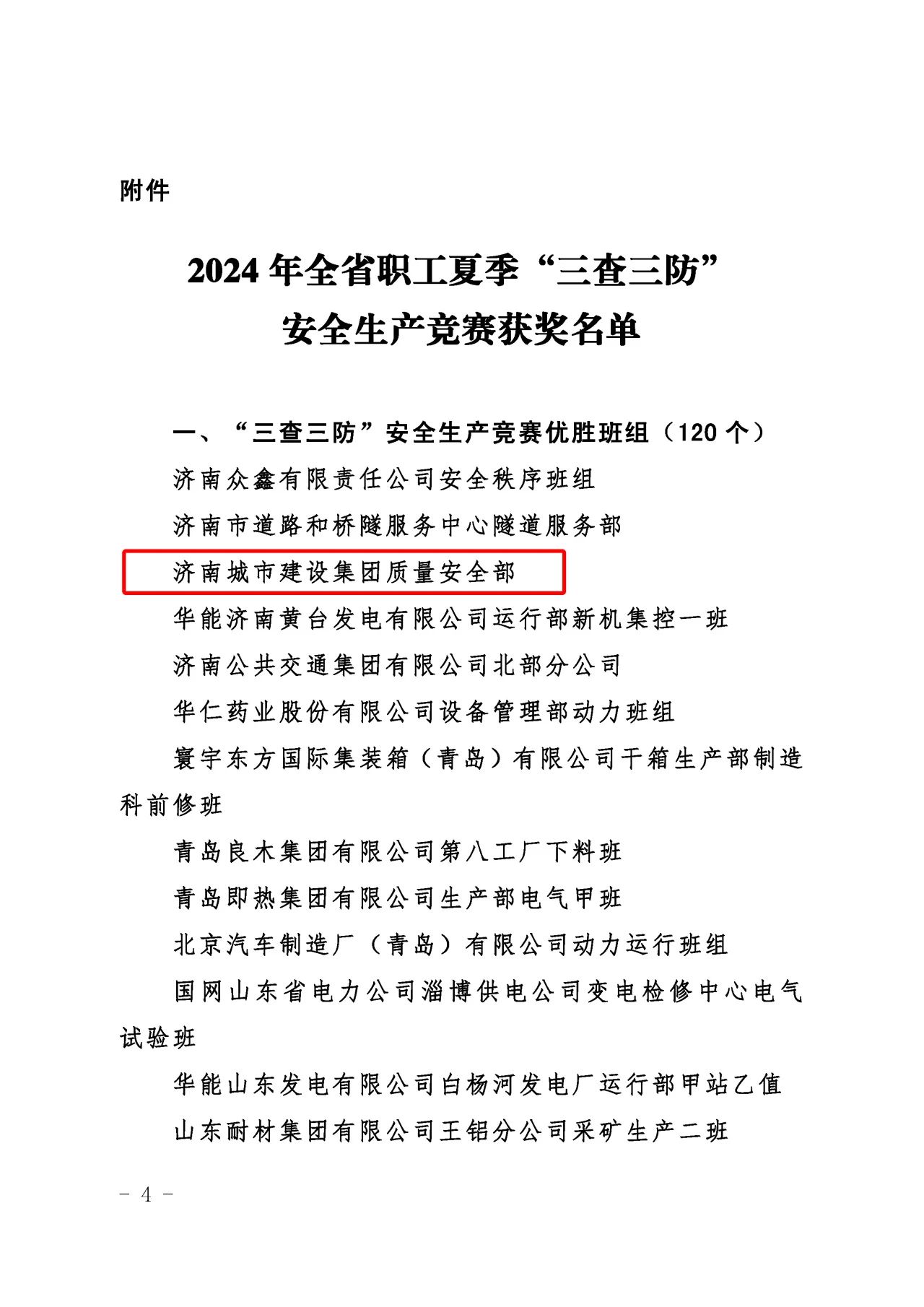近日,山东省总工会、山东省应急管理厅、山东省工业和信息化厅、山东省住房和城乡建设厅、山东省交通运输厅联合发布了《关于公布2024年全省职工夏季“三查三防”安全生产竞赛获奖情况的通知》,济南城市啪啪啦质量安全部积极响应上级主管部门的号召,按照集团党委的科学部署,全面而深入地开展了各项安全专题活动,荣获“三查三防”安全生产竞赛优胜班组荣誉称号。