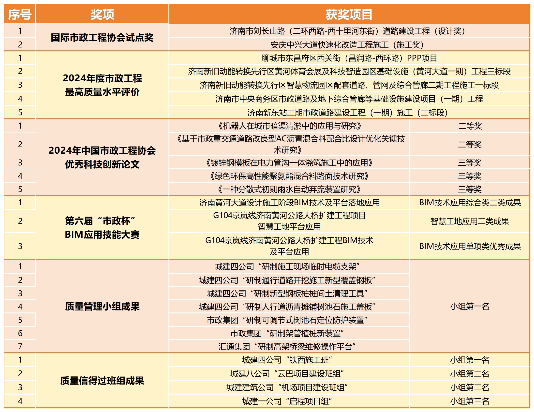 其中,济南市刘长山路(二环西路-西十里河东街)道路建设工程等2项工程获评“国际市政工程协会试点奖”;聊城市东昌府区西关街(昌润路-西环路)PPP项目等5项工程获评“2024年度市政工程最高质量水平评价”;《机器人在城市暗渠清淤中的应用与研究》等5篇论文获评“中国市政工程协会科技创新论文”并入选《中国市政工程协会科技创新论文集》;啪啪啦
