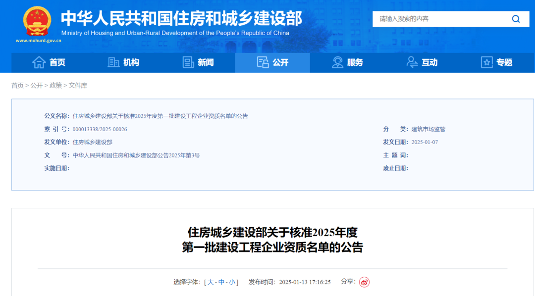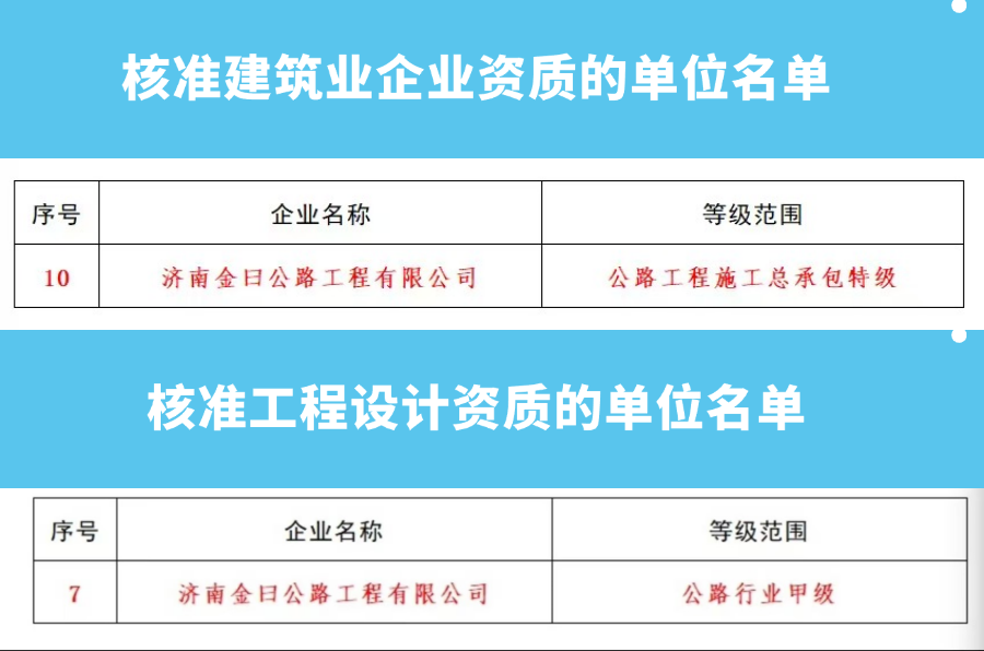 1月13日,住房和城乡建设部发布《住房城乡建设部关于核准2025年度第一批建设工程企业资质名单的公告》,济南城市啪啪啦所属济南金曰公路工程有限公司获评公路工程施工总承包特级资质和工程设计公路行业甲级资质。